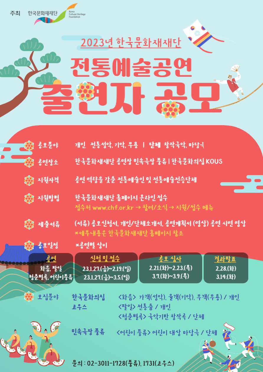 한국문화재재단에서는 전통예술인 및 전승단체를 발굴하여 전승자들에게 공연의 기회를 제공하고 전통문화의 저변 확대에 기여하고자 <2023년도 한국문화재재단 전통예술공연>의 출연자를 아래와 같이 모집합니다. 역량 있는 전통예술인 및 전승단체들의 많은 참여를 바랍니다.