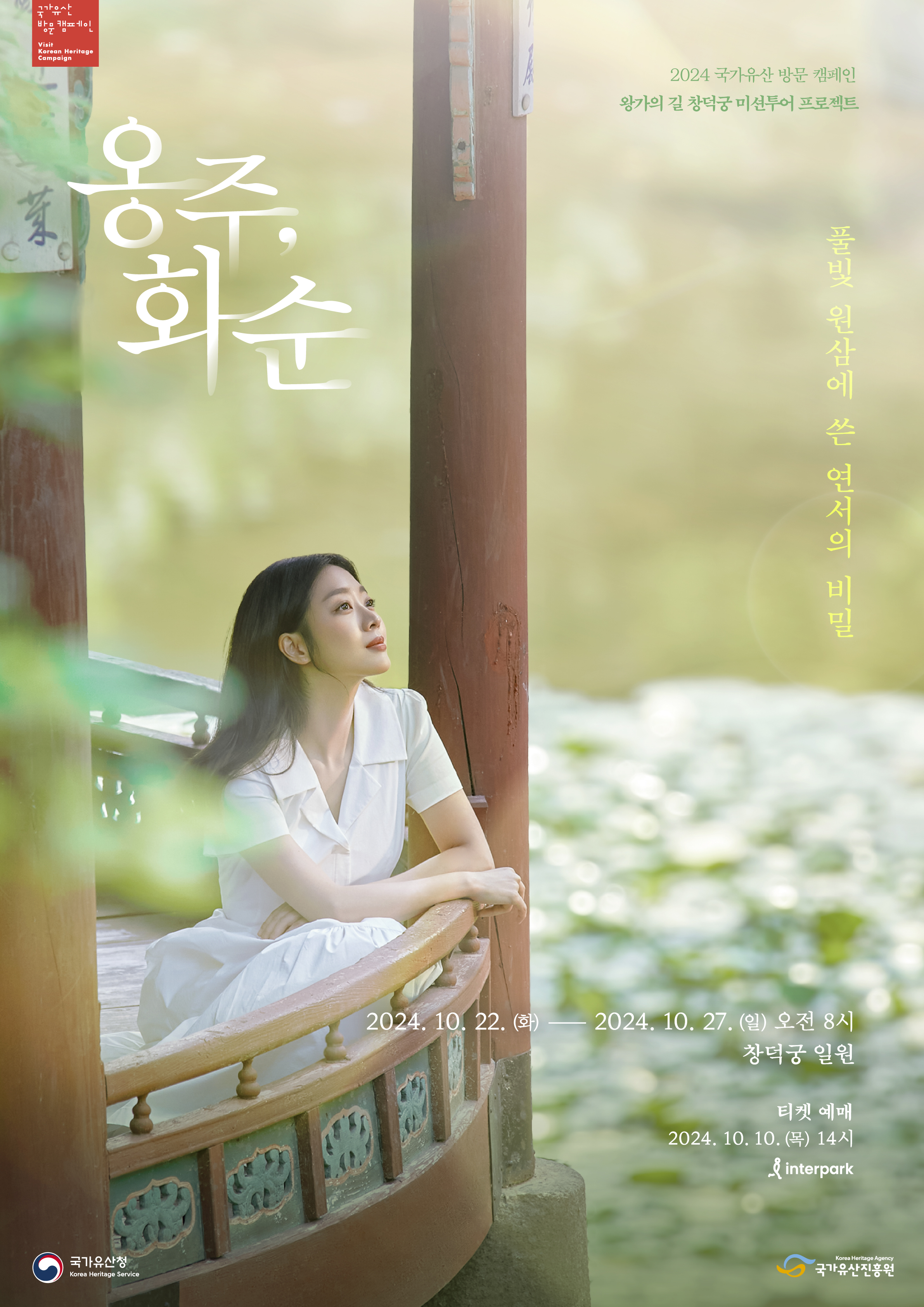 국가유산청(청장 최응천)과 국가유산진흥원(원장 최영창)은 오는 22일부터 27일까지 창덕궁과 종묘에서 <옹주, 화순 – 풀빛 원삼에 쓴 연서의 비밀> 특별 프로그램을 처음 선보인다. 이 프로그램은 「국가유산 방문 캠페인」의 기획 프로그램으로, 화순옹주의 이야기로 꾸며진 AR 콘텐츠를 경험하며 단계별로 미션을 수행해나가는 미션 투어 방식의 프로그램이다.