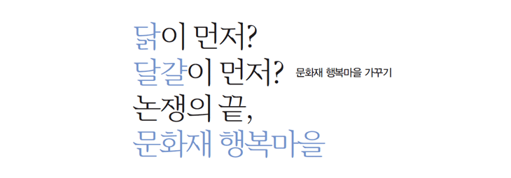 우리 주변을 다시금 돌아보고, 우리가 가진 보물이 무엇인지 알아야 한다. 그리고 활용이냐 보존이냐에 앞서 더불어 살아갈 수 있는 방법이 무엇인지를 스스로 탐구할 필요가 있다. 지금까지 문화재가 국가의 것이었다면 지금부터는 우리의 문화재가 되어야 한다. 마을이 곧 문화이며 마을사람이 그 문화의 주체자임을 인지하고 문화재를 통해 자기성찰의 기회를 삼도록 한다. 문화재는 죽은 것이 아니라 살아서 우리와 함께 성장하고 있는 존재로서 생명력을 불어 넣어야 될 것이다. 여기에는 우리의 창의성이 절대적으로 요구된다. 역사의 산물을 그대로 미래로 전달하는 것이 현재의 역할이 아니라고 한다면, 현재인은 시대적 감성과 철학을 더하여 오늘의 산물로서 재 가치화할 필요가 있다. 물론 혹자는 문화재 훼손과 파괴를 우려하여 ‘원형보존의 원칙’을 강력히 주장할 것이다. 그러나 문화재가 있어 불편하고 불행하다면 어떻게 하는 것이 옳은 것일까? 미래의 누군가를 위해 오늘의 불행을 감수해야만 되는 것일까? 미래에는 행복할까? 이제는 무한 개발시대도 끝이 났다. 우리 스스로 우리의 것을 지키며 함께 성장할 수 있는 기회를 주었으면 한다. 그것이 문화재행복마을에서부터 시작될 수 있을 것이라 기대한다.