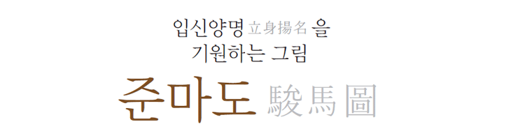 전쟁터에서 왕이나 장수에게 있어 훌륭한 말은 그의 힘과 권위, 그리고 성공과 고귀한 신분을 상징하기도 했는데 이렇게 빠르게 잘 달리는 말을 ‘준마(駿馬)ʼ라고 했다. 준마에 대한 대표적 이야기로는 삼국지의 ‘적토마(赤兎馬)ʼ에 대한 이야기가 있으며, 조선 태조 이성계의 ‘팔준마(八駿馬)ʼ 이야기도 빼놓을 수 없다. 이성계는 왕위에 오르기 전 전쟁터에서 여덟 마리의 준마를 타게 되는데, 이 여덟 마리의 말은 횡운골(橫雲鶻), 유린청(遊麟靑), 추풍오(追風烏), 발전자(發電赭), 용등자(龍騰紫), 응상백(凝霜白), 사자황(獅子黃), 현표(玄豹)다. 세종 때 성삼문(成三問 1418~1456)은 이 ‘팔준마ʼ의 용맹과 덕을 칭송한 ‘팔준도명(八駿圖銘)ʼ을 지어 장원을 하기도 하였다. 선인(先人)들은 말에 대한 이야기뿐 아니라 그림 또한 많이 남겼는데, 이러한 그림을 '준마도(駿馬圖)ʼ라고 한다. 준마도는 예부터 출세, 인재, 장수, 부귀 등을 의미하였는데, 이러한 그림을 그려 소중한 사람에게 선물하거나 판매용으로 제작하였다고 한다. 준마도는 상대방의 급제(及第), 장수(長壽) 그리고 입신양명(立身揚名) 등을 기원하는 선물이었던 셈이다.