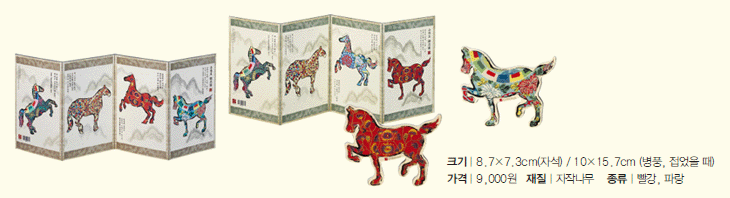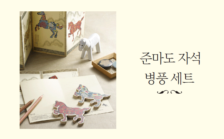 한 마리의 말 혹은 여러 마리의 말을 그린 그림으로 전시급제, 장수 등의 의미를 담아 소중한 사람에게 선물했던 ‘준마도’를 활용한 자석과 카드로 활용할 수 있는 병풍 세트