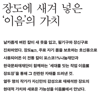 차가운 금속에 따뜻한 감성과 숭고한 예술혼을 불어넣는다. 의미를 잃고 퇴색해가는 전통문화에 현대적 가치를 덧입힌다. 그리하여 단절 위기에 처한 전통 금속공예를 되살린다. 포스코그룹 임직원들의 급여 1% 기부로 설립된 포스코1%나눔재단이 ‘세대를 잇는 작업 이음展’을 기획한 이유다. 소중한 우리 무형문화유산인 전통 금속공예가 그 쓰임새를 잃고 퇴화하는 일 없이 후세에 이어져 새로운 가치를 부여받기 바라는 마음을 이음展에 담은 것. 올해로 두 번째를 맞는 이 뜻깊은 전시는 한국문화재재단의 참여로 더욱 풍성한 결실을 거두게 됐다. ‘두석장’을 주제로 한 첫 번째 전시가 전통 금속공예 장인과 현대 작가의 협업 가능성을 타진한 것에서 만족해야 했다면, ‘장도장’을 주제로 한 이번 전시는 전통문화와 현대 예술의 진정한 컬래버레이션을 완성했기때문이다.