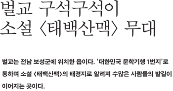 작가 조정래는 소설 태백산맥에서 벌교를 이렇게 설명하고 있다. ‘벌교는 한마디로 일인日人들에 의해서 구성, 개발된 읍이었다. 그 전까지만 해도 벌교는 낙안 고을을 떠받치고 있는 낙안벌의 끝에 꼬리처럼 매달려 있는 갯가 빈촌에 불과했다. 그런데 일인들이 전라남도 내륙지방의 수탈을 목적으로 벌교를 집중 개발시킨 것이었다.’ 이 작은 갯가 마을이 어떻게 소설의 중심 공간이 되었을까. 권영민 서울대 명예교수는 “작가 조정래가 설명하고 있는 벌교는 어찌 보면 평범한 소읍에 지나지않는다”며 “그러나 이 평범함 속에 배태되어 있는 무서운 폭발력을 작가만이 감지하고 있다”고 말한 바 있다.권영민 교수의 <태백산맥 다시 읽기> 아마도 그 ‘무서운 폭발력’이 열쇠인 듯하다.