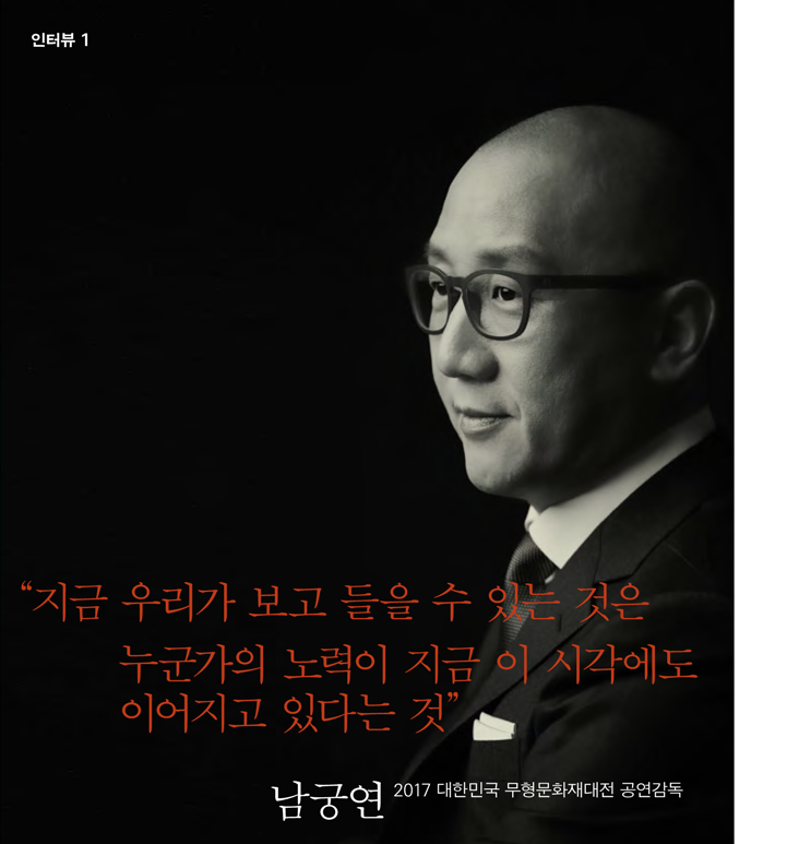 공연을 기획하면서 무형문화재의 가치와 전승에 관한 명확한 초점을 싣는 데 역점을 두었습니다. 흔히 국악을 포함한 무형문화재를 과거에 머무른 화석화된 예술로 생각하기 쉬운데, 지금 우리가 보고 들을 수 있는 것은 누군가의 노력이 지금 이 시각에도 이어지고 있다는 의미입니다. 현재의 노력이 없이는 과거와 미래를 이을 수 없는 것이 전통입니다. 이러한 맥락에서