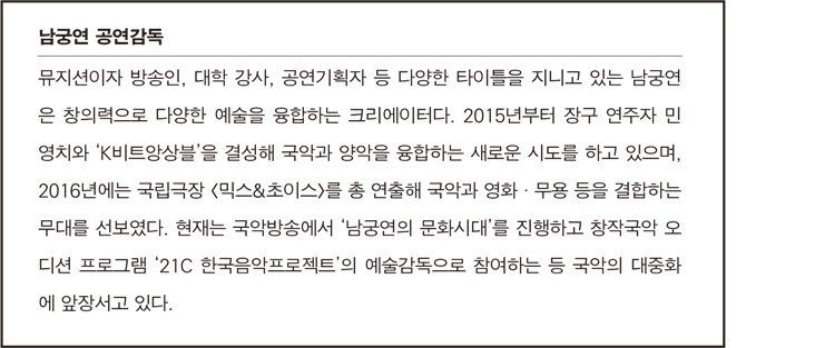 먼저 공연감독을 맡게 돼 부담과 책임감이 크다는 고백을 해 봅니다. 국악을 모르지는 않지만 그렇다고 아주 잘 아는 전문가가