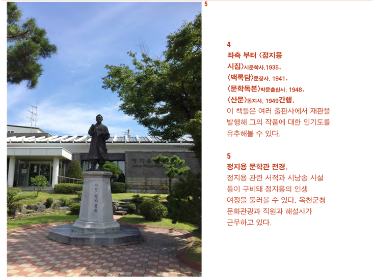 도시샤대학에서 평론가 김환태 등을 만난 정지용은 「띠」와 「홍시」 등을 낭송해 주며 고향에 대한 그리움을 삭였다. 그는 휘문고보, 서울대, 이화여대 등에서 교편을 잡았고 『경향신문』의 주간을 지내며 청록파 시인 등을 배출하는 등 한국문단에 큰 족적을 남겼다. 정지용은 1950년 7월 그믐께정지용의 장남 정구관의 증언 녹번리 초당에서 설정식 등과 정치보위부에 나가 자수 형식을 밟다가 납북된 것으로 추정된다. 1988년 정지용 작품이 해금되고, 그의 고향 옥천에 생가 복원1996과 문학관을 개관2005하였다. 지난 5월 그의 문학혼을 기리는 ‘30회 지용제’를 성황리에 치렀다.
