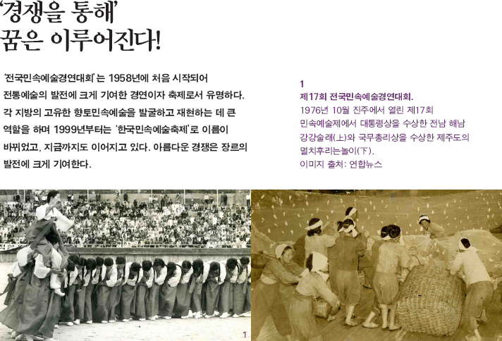 ‘전국민속예술경연대회’가 생기기 전에는 ‘농악경연대회’ 가 참 많았다. 광복 이후 서울 장안의 최대 볼거리는 ‘농악’ 이었다. 광복 후 국악원(당시 민속악이 중심이 된 민간단체 로, 훗날 ‘대한국악원’으로 이름을 바꿈)이 처음 연 큰 행사 가 ‘전국농악경연대회’로, 당시 시공관에서 열렸다. 그 무렵 농악은 최고의 흥행물이었으며, 지방에서 올라온 내로라 하는 농악단체들이 자웅을 겨뤘다. ‘전국민속예술농악대제 전’(1947년)은 전국 각지에서 올라온 농악대들이 저마다의 기량을 뽐낸 최고의 축제였다. 1950년대에 해마다 열린 농 악대회는 창경궁(당시 ‘창경원’)과 덕수궁에 모인 상춘객들 에게 ‘농악’이란 볼거리를 통해서 삶의 에너지를 충전시켜 주는 최고의 페스티벌이었다.