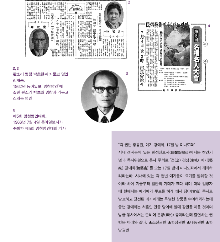 ‘명창명인대회’를 아는가? 동아일보사 주최로 1962년에 시 작됐다. 1970년대 중반부터 ‘명인명창’이라고 이름이 바뀌 었으나, 그전에는 ‘명창명인’이라고 했다. 동서를 가리지 않 고 음악의 기본은 ‘노래’다. ‘명창명인대회’에서는 당대 내 로라하는 판소리 명창이 선의의 경쟁을 펼쳤다.