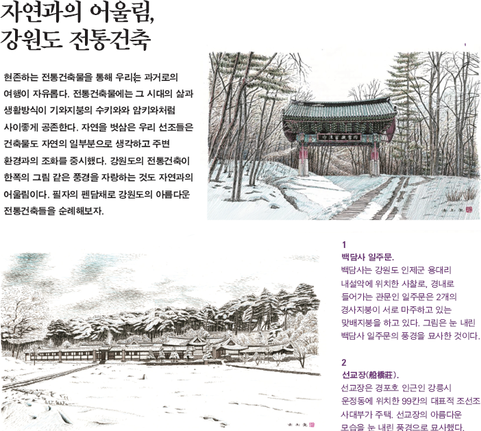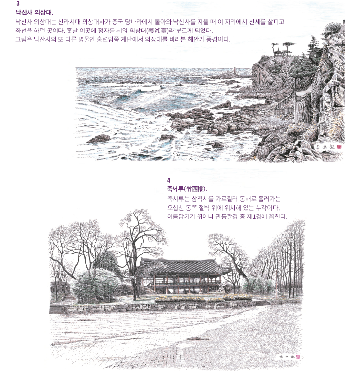 정자 옆으로 온갖 해풍을 견디며 자라난 몇 그루의 해 송과 정자의 인공미는 저 멀리 수평선과 더불어 멋진 풍 경화를 만들어 낸다. 낙산사의 또 다른 명물인 홍련암(紅 蓮庵)으로 발길을 옮기면서 의상대 쪽을 바라보면 정면에 서 볼 수 없던 절경과 마주하게 된다. 그림은 홍련암 쪽 계 단에서 의상대를 바라본 해안가 풍경이다. 홍련암에는 다 음과 같은 설화가 전하여진다. 의상대사가 좌선한 지 7일 째 되는 날 바닷속에서 갑자기 홍련이 솟아오르더니 그 홍 련 속에서 관음보살이 나타났다. 의상이 마음속에 품고 있 던 소원을 기원하자 만사가 뜻대로 이루어져 그는 이곳에 암자를 짓고 이름을 홍련암이라 하였다 한다. 지붕의 모습 은 정면이 人자 모양의 팔작지붕이고 뒤쪽은 바위와 벽 사 이가 좁아 맞배지붕으로 되어 있다. 주출입구가 있는 쪽이 통상 건물의 정면이나 바위 위에 놓이다 보니 전면으로 공 간의 여유가 없어 측면으로 진입하는 형식을 취하고 있다. 이 암자는 큰 바위 사이에 건물이 놓여 건물 내부 바닥에 마련된 조그만 유리 구멍을 통해 그 아래로 바위 사이를 드나드는 힘찬 파도의 모습을 볼 수 있다. 그림은 의상대 에서 홍련암 쪽으로 내려가는 길목에서 바라본 모습이다.